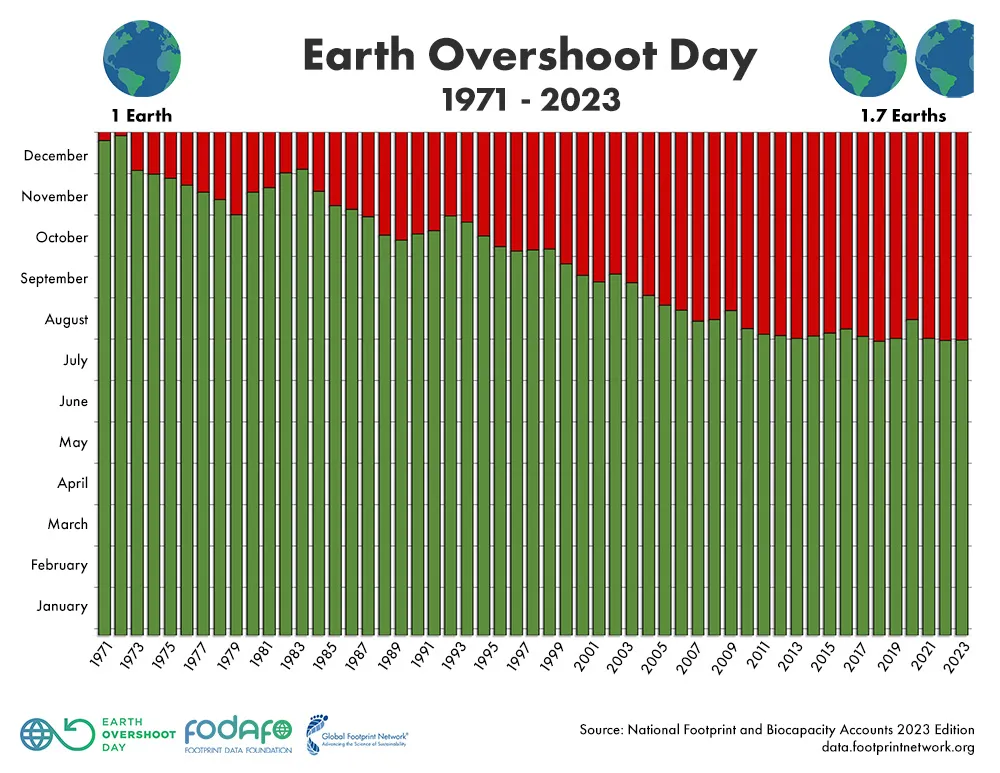 Der globale Welterschöpfungstag für 2024 wird am 5. Juni bekannt gegeben. Letztes Jahr fiel er auf den 2. August. Das bedeutet, dass wir ab diesem Zeitpunkt auf Kosten der Zukunft und nachfolgenden Generationen leben. Für Österreich liegt dieser Zeitpunkt bedauerlicherweise sehr viel früher im Jahr, für heuer nämlich am 07. April (2023: 6. April).