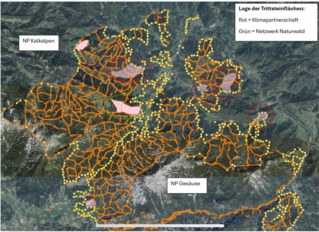 Zusätzlich zur Flächenerweiterung des Wildnisgebiets Dürrenstein-Lassingtal, werden durch die Klimapartnerschaft.at auch Flächen außerhalb des Schutzgebiets außer Nutzung genommen. Zwischen den bedeutenden Schutzgebieten Nationalpark Kalkalpen, Nationalpark Gesäuse und dem Wildnisgebiet Dürrenstein-Lassingtal sollen in den kommenden Jahren neue Lebensräume für Wildtiere und Pflanzen entstehen. Durch sogenannte Trittsteinflächen werden neue Flächen geschaffen, die zum Erhalt der biologischen Vielfalt beitragen.