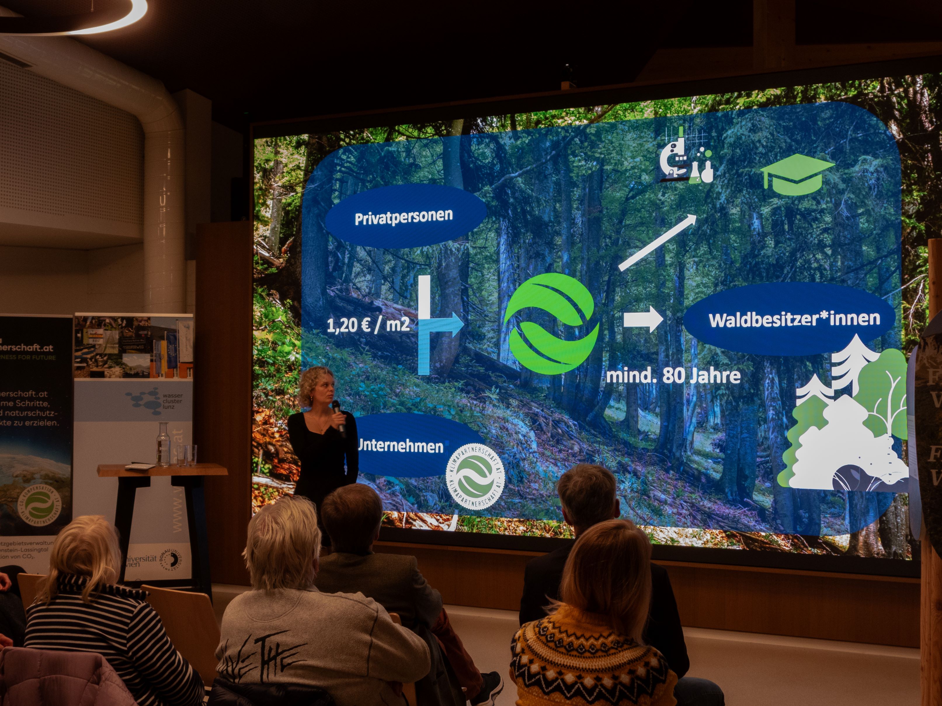 Im Anschluss hielt Nina Schönemann BSc einen Vortrag über die Klimapartnerschaft.at, eine Initiative der Schutzgebietsverwaltung Wildnis Dürrenstein-Lassingtal, durch die Flächen langfristig der Natur zurückgegeben werden können. Da nicht nur der Schutz von alten (Ur-)Wäldern von Bedeutung ist, sondern vielmehr auch die Auswirkungen der Biodiversitätskrise und des Klimawandels eine große Rolle spielen, hat die Schutzgebietsverwaltung die Initiative Klimapartnerschaft.at gegründet. Nina Schönemann ist Geschäftsführerinder Initiative und erklärte, wie Unternehmen, Waldbesitzer*innen und auch Privatpersonen die Möglichkeit haben, die Initiative zu unterstützen und sich so aktiv am Klima- und Naturschutz zu beteiligen. Naturnahe Wälder stellen einen sehr wertvollen CO2-Speicher dar und liefern uns Menschen wichtige Lebensgrundlagen, wie saubere Luft und sauberes Wasser. In genutzten Wäldern werden diese Ökosystemleistungen reduziert, daher ist es wichtig naturnahe Waldflächen zu schützen, so kann auch die Bindungsfähigkeit von Kohlenstoff am besten genutzt werden.